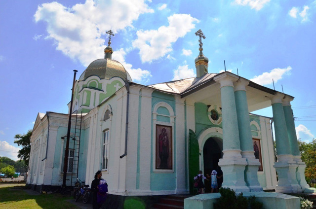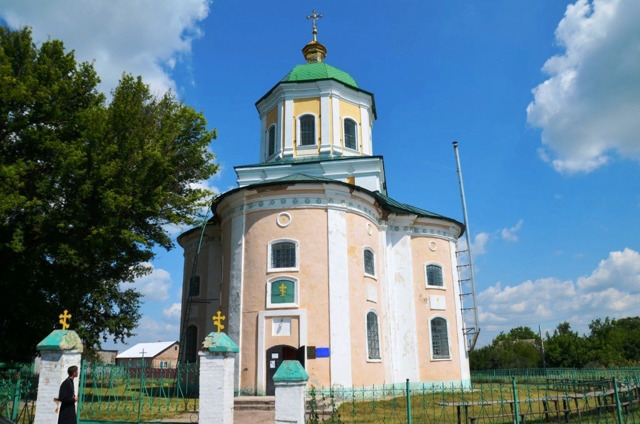 Цегляний храм у перехідному стилі від бароко до класицизму збудований у 1786 році коштом купця Миколи Годжія. Тетраконхова будівля у плані має вигляд хреста, увінчана високим восьмигранним трибуном та куполом. Візуально подібна до дерев'яних козацьких храмів.