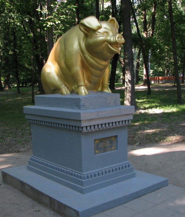 Пам'ятник свині з написом на постаменті "Від вдячних українців" відкрито у міському парку міста Ромни в 2000 році.