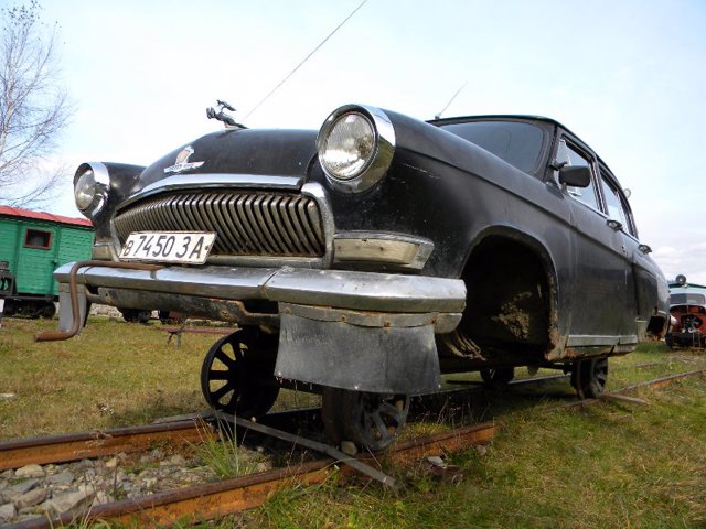 Особливий експонат Колочавської вузькоколійки - автомобіль "Волга" ГАЗ-21 на залізничному шасі.