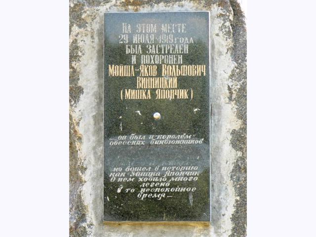 Пам'ятник встановлений при вході до парку "Мар'їн гай". На гранітному камені розміщена табличка з написом: "На цьому місці 29 липня 1919 року був застрелений і похований Мойша-Яков Вольфович Вінницький. Він був і "королем" одеських бінджників, але увійшов в історію як Мишко Япончик. Про нього ходило багато легенд у той неспокійний час".