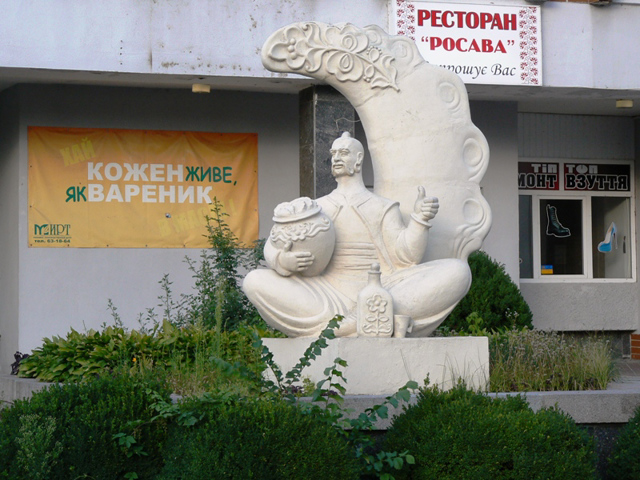 Скульптура представляє собою козакаа Мамая, який їсть вареники. За його спиною розміщено величезний вареник у вигляді півмісяця.