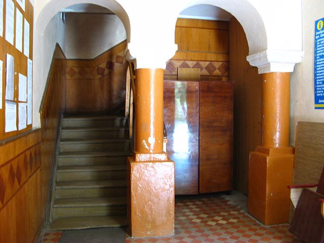 Будівля прямокутна, двоповерхова, з невеликою годинниковою вежею на куті. Декор трохи нагадує синагогу.