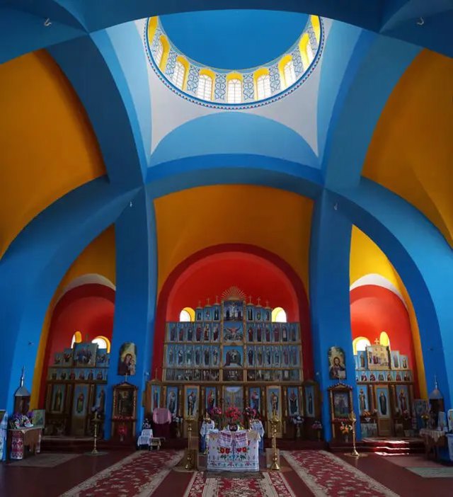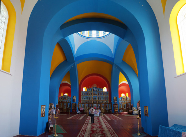 Інтер'єри Покровської церкви вражають яскравими кольорами та майже повним відсутністю розписів.