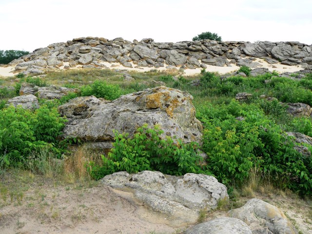 Гігантське нагромадження каміння висотою до 12 метрів - залишки пісковика колишнього Сарматського моря. За формою нагадує курган, звідки і походить назва. "Кам'яна Могила" з найдавніших часів використовувалося як святилище. Багато каменів покриті зображеннями епох палеоліту, мезоліту, міді-бронзи та середньовіччя (від XVI-XIII тисячоліть до нашої ери до X-XII століть).