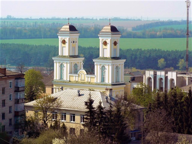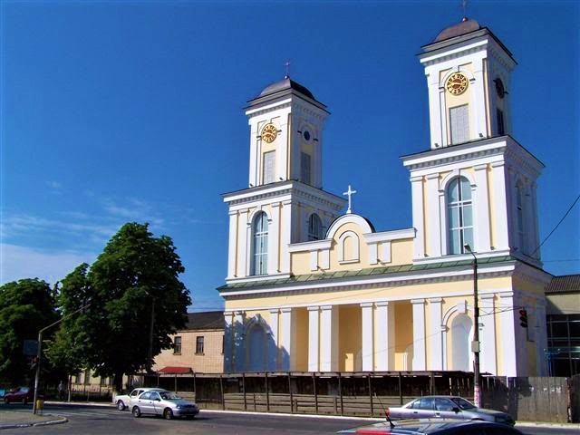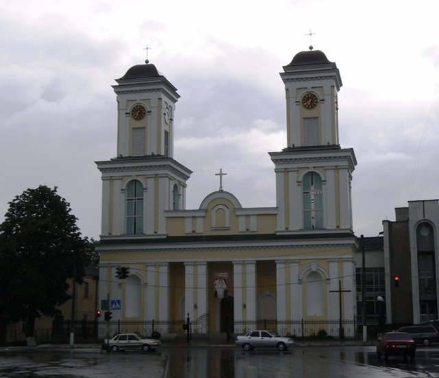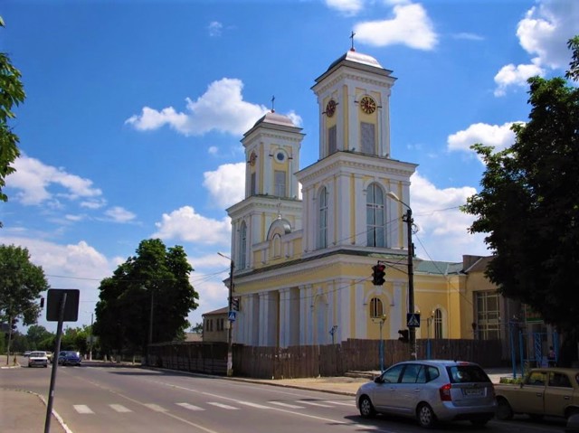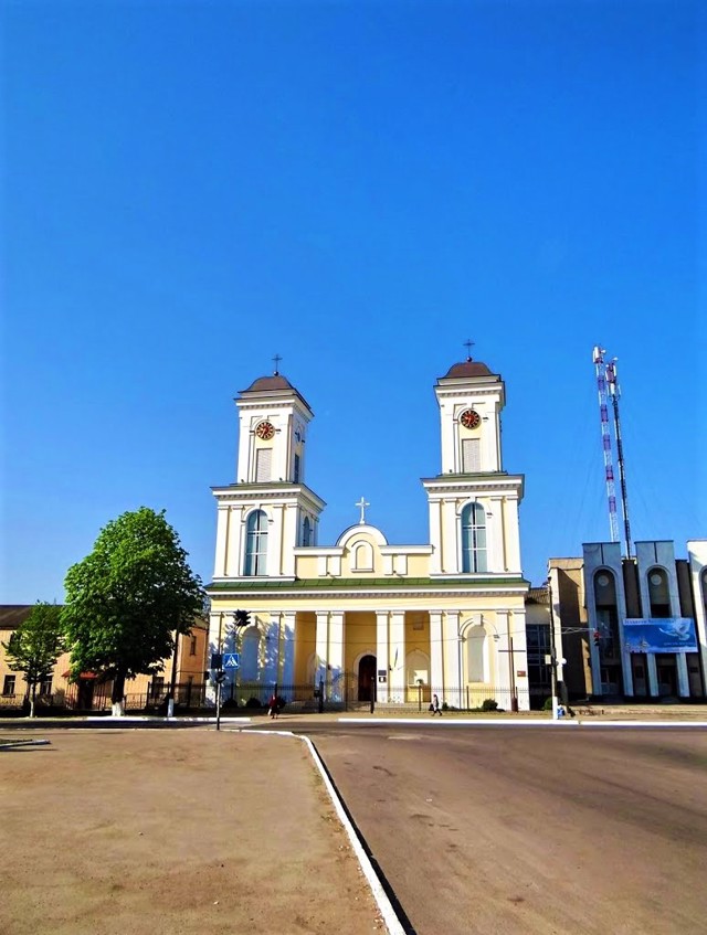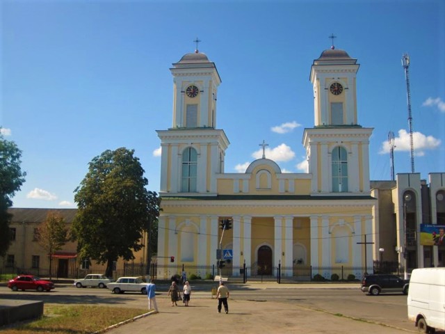В 1805 році, після того, як згорів дерев'яний храм, костел був заново відбудований у камені коштом графа Станіслава Потоцького. Дві його величезні симетричні башти на фасаді домінували над міською забудовою.