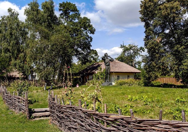 На дворі садиби встановлено ефектний, експресивний пам'ятник Довженку (1974 рік, скульптор Анатолій Фуженко, архітектор Анатолій Ігнащенко).