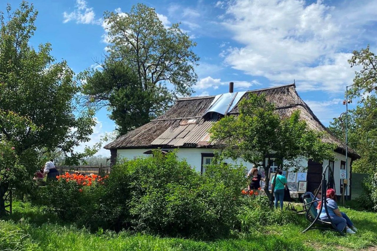 Посеред сільського подвір'я розташована велика хата під очеретом, забудова на початку ХІХ сторіччя. У давнину це була сільська корчма.