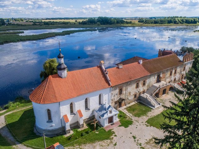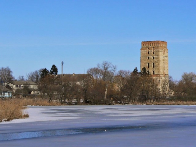 Гарна п'ятиповерхова будівля водяного млина з червоної цеглини добре проглядається від замку Острозьких в Старокостянтинові на протилежному березі річки.