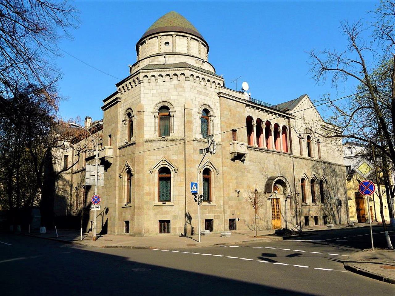 Цікаві особливості - гранована вежа з шоломоподібним куполом прикрадає, що будівля збудована під кутом 78 градусів, під яким вулиці примикають одна до одної; водостічні труби заховані в стіну, щоб їхня тінь візуально не розбивала фасад; а на барельєфі з боку вулиці Шовковичної зображено архітектора власною персоною в образі кота.