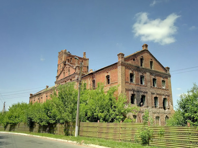 Гарна п'ятиповерхова будівля водяного млина з червоної цеглини добре проглядається від замку Острозьких в Старокостянтинові на протилежному березі річки.