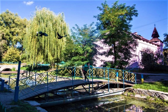 На березі ставка стоїть маленька неоготична будівля дитячої школи мистецтв з двома гостроверхими вежами.