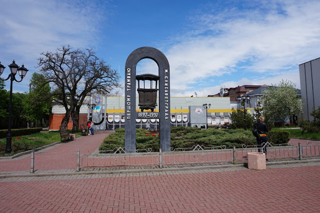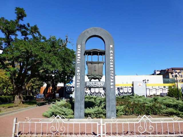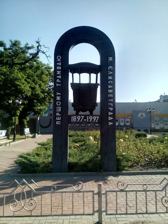 Пам'ятник першому трамваю, запущеному в Кропивницькому у 1897 році, встановлено на розі вулиць Театральної та Шульгиних до 100-річчя першої трамвайної лінії міста.