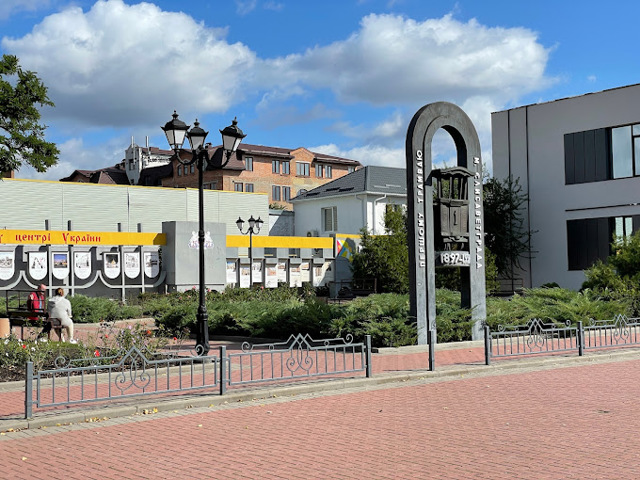 Скульптура у вигляді арки з поміщеним у неї стилізованим зображення трамвайного вагона створена скульпторами Віктором Френчком та Аркадієм Мацієвським.
