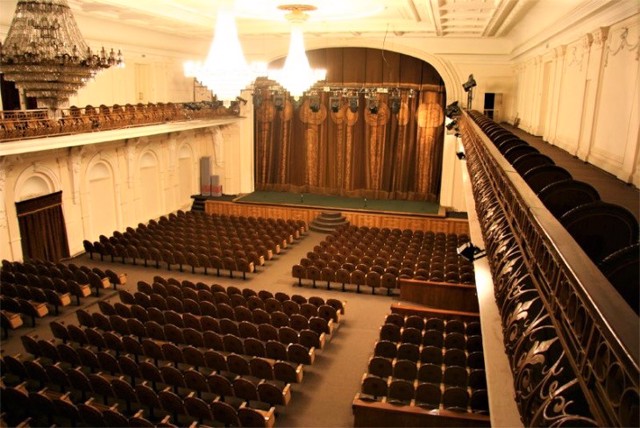 Будівля була прибудована як театрально-концертна зала до колишнього англійського клубу (архітектор Федір Булацель). Реконструйована в 1978-1979 роках. Збережено картуші з цифрами "1838" та "1913" - дати заснування клубу та його 75-річчя. Фасад прикрашений скульптурним триптихом, що відбиває етапи творчого шляху театру. Закруглений кут увінчаний фігурою музи.