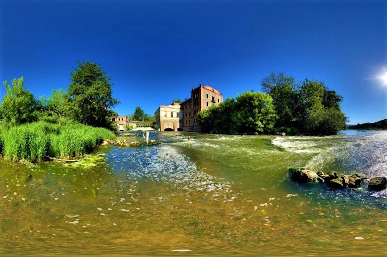 Витончений чотириповерховий промисловий будинок збудований німецькими майстрами за проєктом архітектора Яна Гойріха в кінці ХІХ століття, коли цими землями володів граф Костянтин Потоцький. Стіни виконані з бутового каменю та червоної цегли, зберігся металевий декор та частина старовинного обладнання. Поруч знаходиться кам'яна будівля складу, а на протилежному березі каналу - крупорушка.