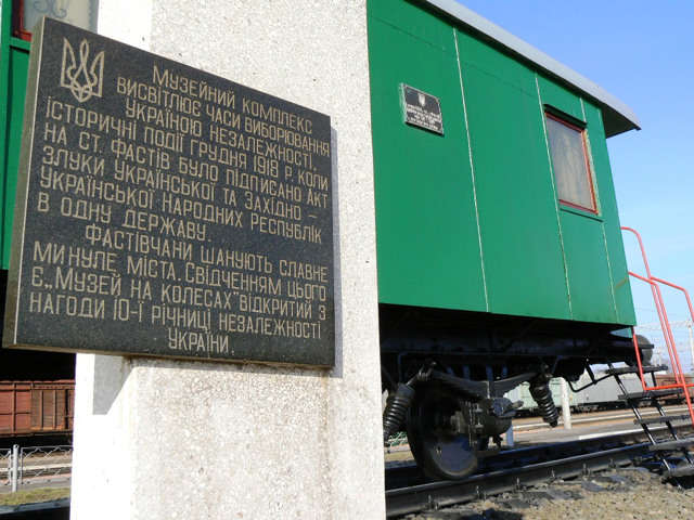 "Музеєм на колесах" називають Музей-вагон Злуки УНР та ЗУНР, що стоїть на залізничній станції "Фастів" разом зі старовинним паротягом.