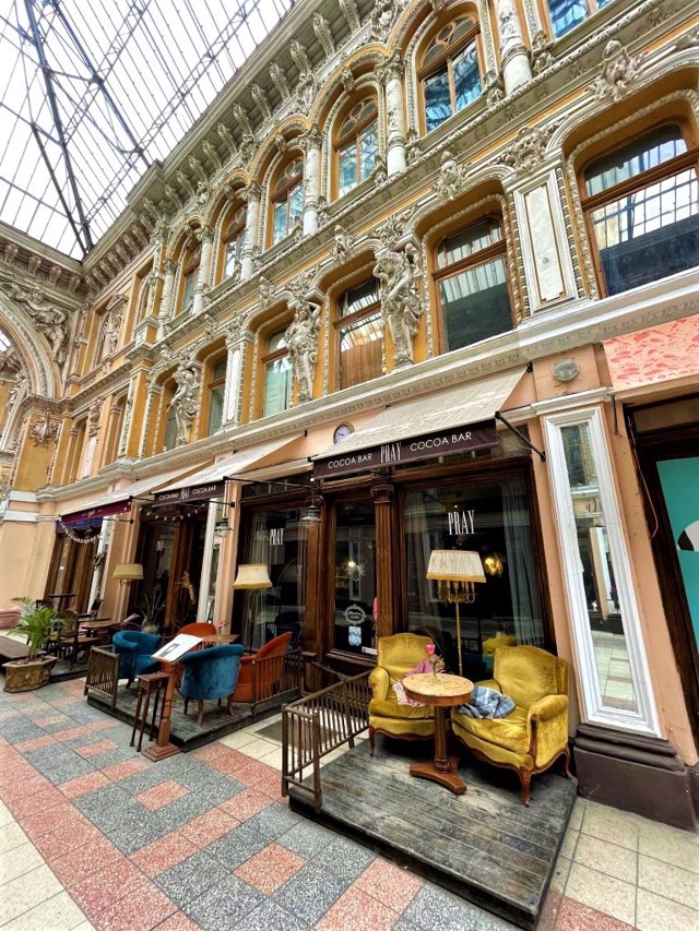Від початку будівля проєктувалась як готельно-торговельний центр. У внутрішньому дворі Готелю "Пасаж" знаходиться ціла вулиця з рядами елітних магазинів. Високий дах зі скла над галереєю доповнює відчуття неосяжного простору та несе світло усередину будівлі.