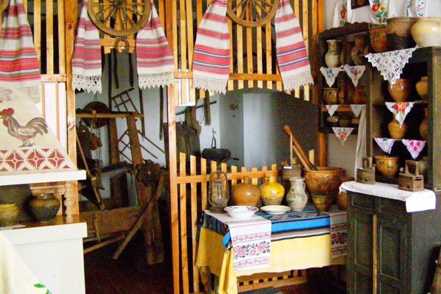 В етнографічному розділі відтворено інтер'єр традиційної української хати з пічкою, лавами, скринями, мисниками, іконами та вишитими рушниками. Тут представлені речі сільського побуту: ночви, бочка, мірка, хлібна діжа, решето, сито, рубель для прасування, коромисло, плетені вироби з кори й лози – кошики й корзини. Також можна побачити сільськогосподарське знаряддя: серп, ціп, зернотерку, ручний млин і ярмо для волів.