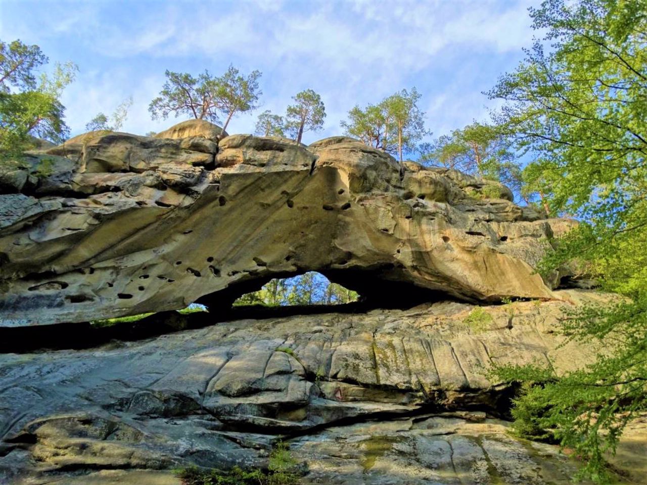 Внаслідок вивітрювання в 40-метрових скелях пісковика утворилося багато отворів, вони ніби продірявлені.