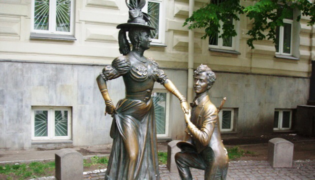 Пам'ятник героям кінокомедії "За двома зайцями" Проні Прокопівні і Свириду Голохвастову встановлений у Києві на початку Андріївського узвозу, де знімався фінальний епізод фільму - викриття Свирида Петровича перед вінчанням в Андріївській церкві.