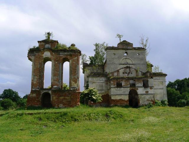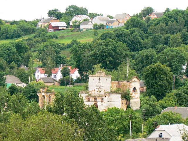 Руїни костелу Святого Станіслава розташовані на протилежному від палацу Вишневецьких березі річки Горинь і його добре видно з палацових та паркових терас.