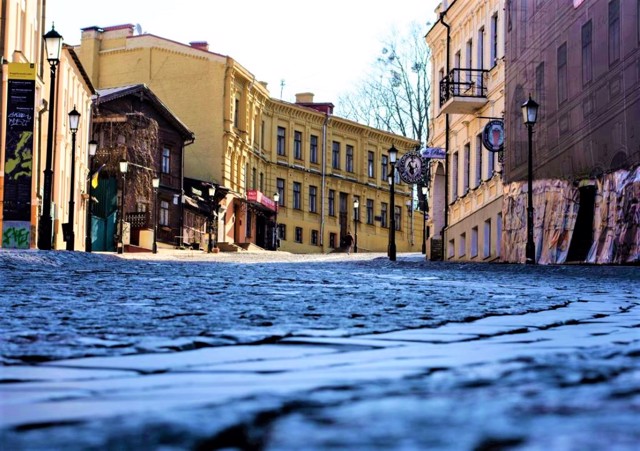 Мощена грубим каменем дорога круто звивається між старими одно-двоповерховими будинками. Це колоритне місце, що зберігає дух старого Києва, уподобане художниками та торговцями сувенірами, тут завжди багато туристів.