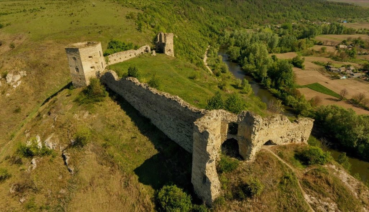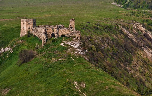 The well-preserved ruins of a defensive castle rise on Mount Strelka above Zbruch.