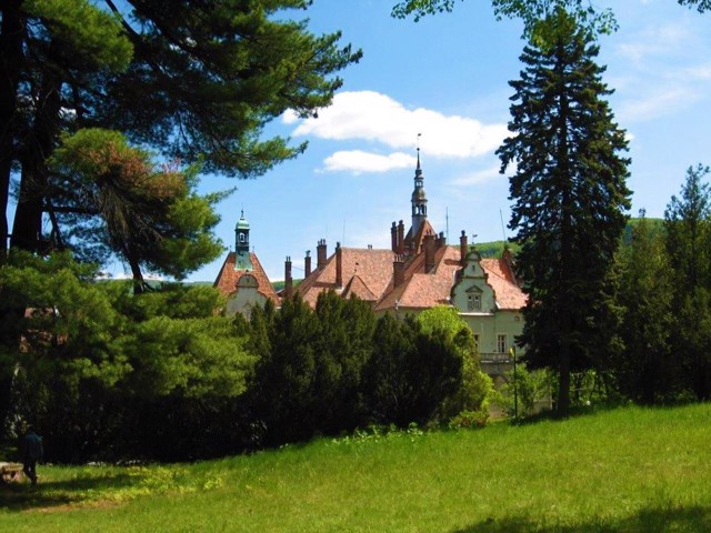The palace is located in the center of an English park with an area of 19 hectares with a natural landscape where rare species of trees and shrubs are found: boxwood, sakura, Weymouth pine, Canadian spruce. The outline of the park pond repeats the map of Austria-Hungary.