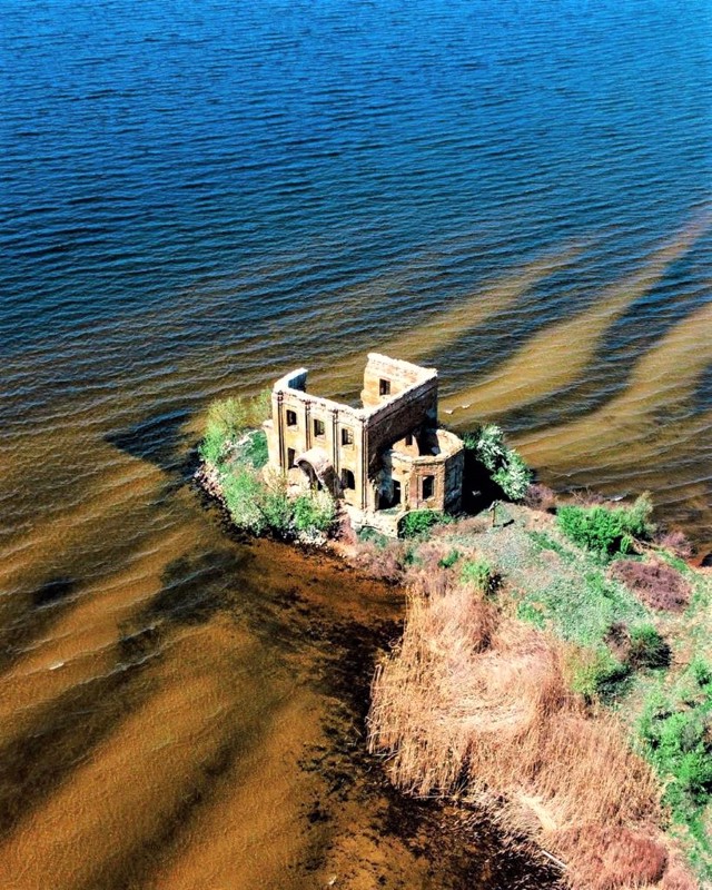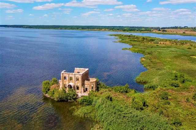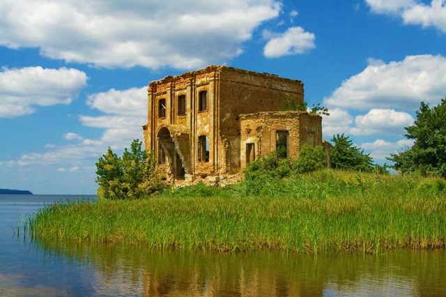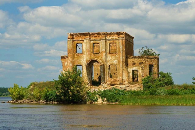 The ruins of the flooded church of Saint Elijah are the only preserved structure of the flooded village of Tsybli, which was moved to the high bank of the Dnipro in connection with the construction of the Kaniv Reservoir.