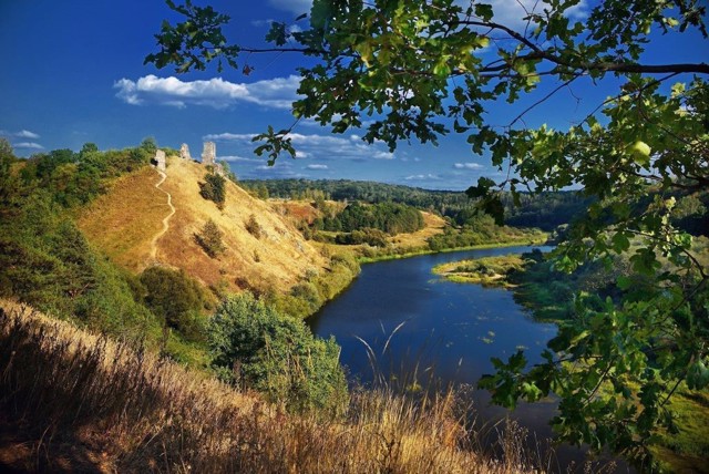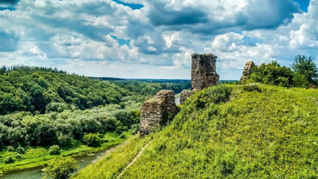The romantic ruins of the Hubkiv Castle adorn the picturesque rocky shore of the Sluch River.