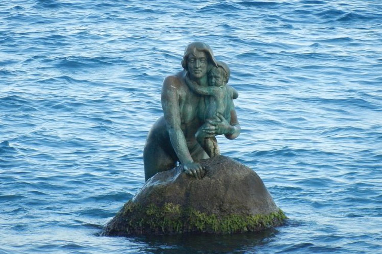 Скульптура русалки встановлена у воді поблизу пляжу.