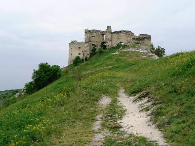 The well-preserved ruins of a defensive castle rise on Mount Strelka above Zbruch.