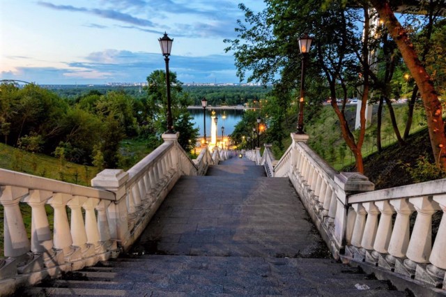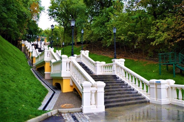The monument is connected to the upper part of the Volodymyrsky Descent by steep stairs.