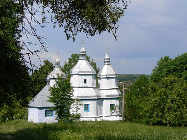 The wooden Saint Michael's Church in Voronovytsia is a typical 18th-century three-part Podillya church.