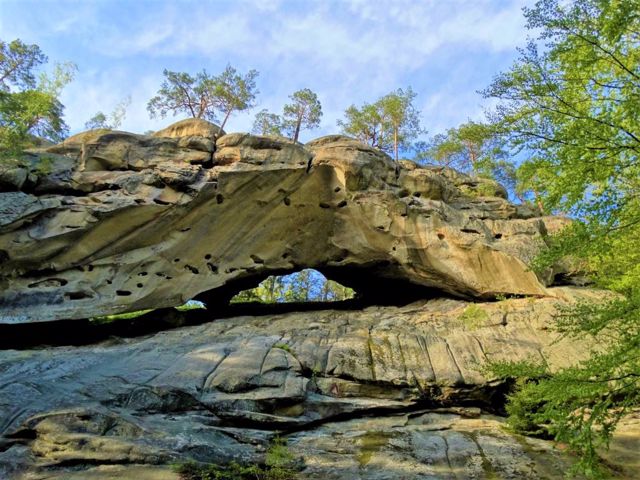 The most impressive arched rock is Hawkeye - a rare form of karst in the Carpathians. The arch at the top of the rock resembles the shape of eyes, hence the name. At the foot of the rock is a small three-chambered cave.