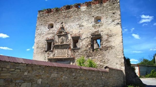 The thickness of the walls of the stone square structure reaches 2.2 meters. The walls have loopholes with cheeks that expand in both directions. Remains of white stone decoration in the Baroque style have been preserved.