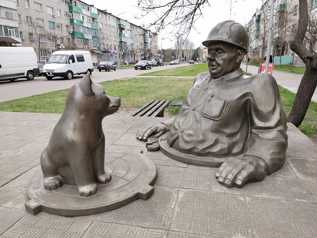 The sculpture of a plumber, looking waist-deep from a sewer hatch, is one of the new sights of Horishni Plavni.