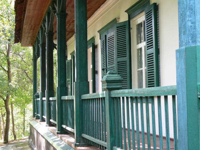 It got its name because of the predominant green color: green roof, green shutters, green gallery. Part of the Davydov library, a billiard room and tables for games were located in this outbuilding, which is why it is also called the "House of Cards".