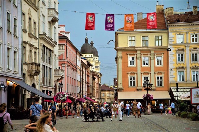 There are always many tourists on Rynok Square in Lviv, especially on the days of numerous holidays and festivals.