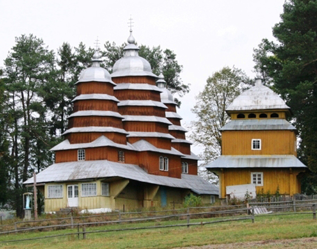 The church was built by Boyko masters Ivan Melnykovych and Vasyl Ivanykovych, and is characterized by an unusual multi-tiered structure. In plan, the temple consists of three square log cabins: a larger central one and smaller side ones. All log cabins are covered with helmet-shaped partitions with intercepts on pyramidal figures of eight with folds (the central head has five folds, the lateral ones have four folds each).