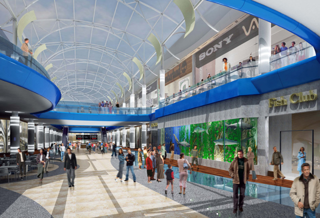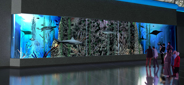 Гігантська штучна водойма з акриловими вікнами має об'єм 360 тисяч літрів. До 16-метрової панорами акваріума мають вихід усі основні галереї торгового комплексу.