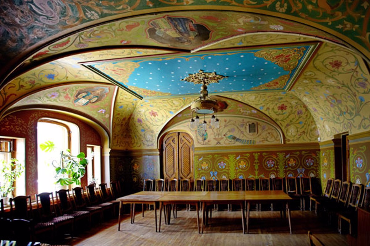 The ceremonial hall is decorated with stucco molding and a painted ceiling on the ceiling by the artist Mykola Uvarov. The dining room is painted in the style of ancient Russian terems by the artist Mykhaylo Pestrykov. Beketov's office is decorated with carved oak.