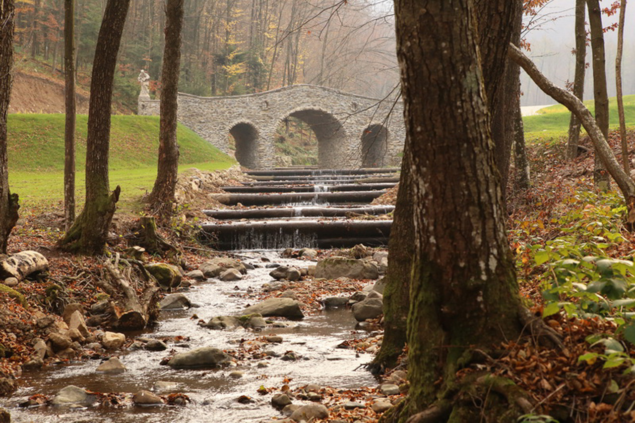 Shenborn Park is set among the mountains of the Turya Valley around the dammed Lake Tur with an island in the shape of the 1867 Austro-Hungarian borders, accessible by raft. Each element of park architecture has a certain symbolic meaning. For example, 7 lanterns of different shapes correspond to the days of the week, 12 bridges symbolize the signs of the zodiac. In the Celtic Grove, you can see the Druid calendar in the runic circle and various trees corresponding to people's birth dates. Above the lake stands the water mill of Saint John with ancient millstones. The Baroque Bridge of the Four Evangelists is decorated with sculptures of Saints Luke, John, Mark and Matthew. You can also find several mini-sculptures of Celts by sculptor Mykhaylo Kolodka in the park.