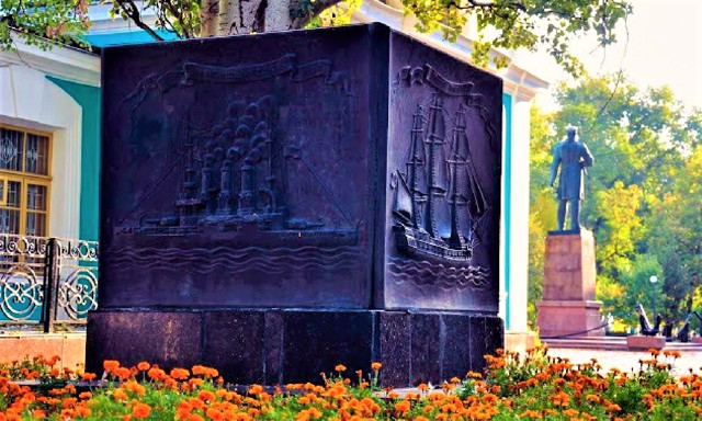Пам'ятник має вигляд куба, на гранях якого висічені зображення кораблів та довгий напис, перше та останнє слово якого складають фразу "тут шара".