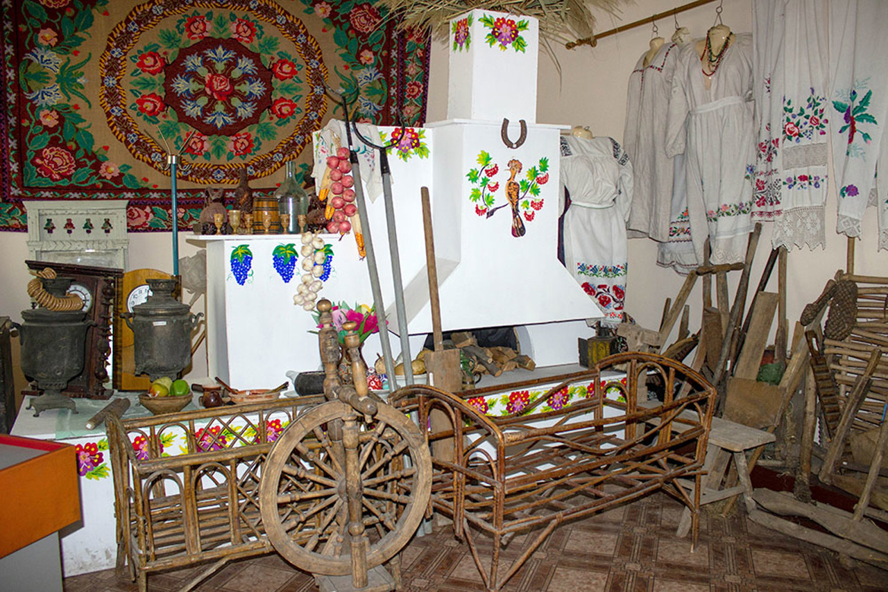 Відтворено інтер'єр української хати XIX – початку XX століття: лави, плетене дитяче ліжко, самовари, макітри, коромисла, рубелі, праски, прялка.