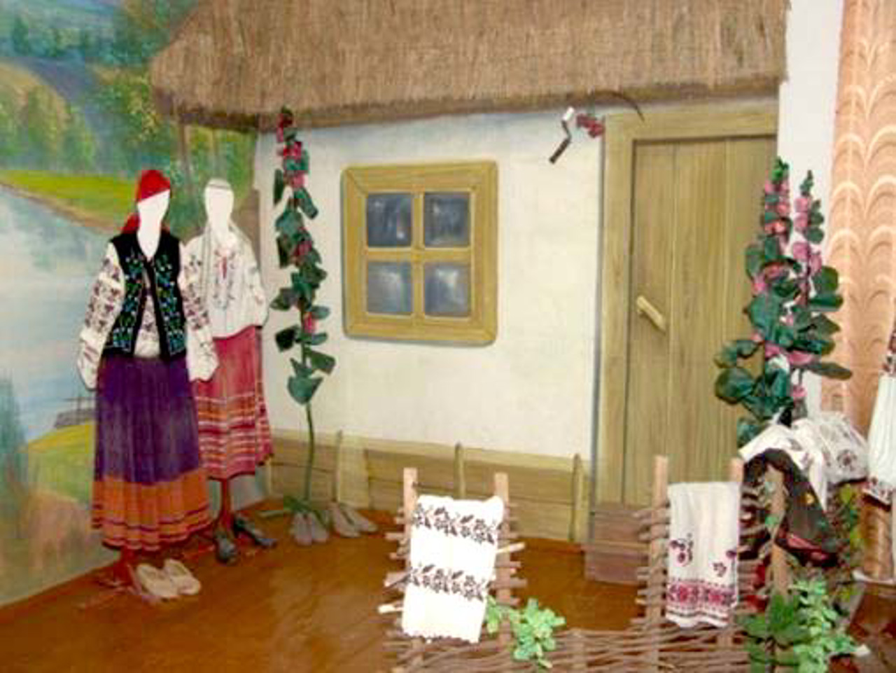 In the center of the exposition is a panorama of the village with picturesque landscapes. The interior of a traditional Ukrainian home has been recreated: a stove, benches, a table, a chest, a icons, a cradle, a shrine, shelves, basins with dishes, towels, samples of Ukrainian national clothing.