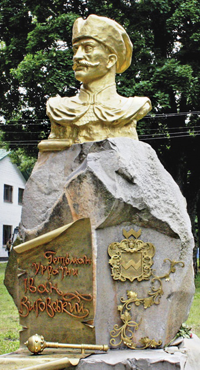 The bust of Ivan Vyhovsky is installed on a pedestal made of quartzite clay. A metal plate in the form of a charter with the image of hetman attributes: a metal forged coat of arms and a mace, with the inscription: "Ivan Vyhovsky - Hetman of Ukraine". The total height of the monument is 4 meters.