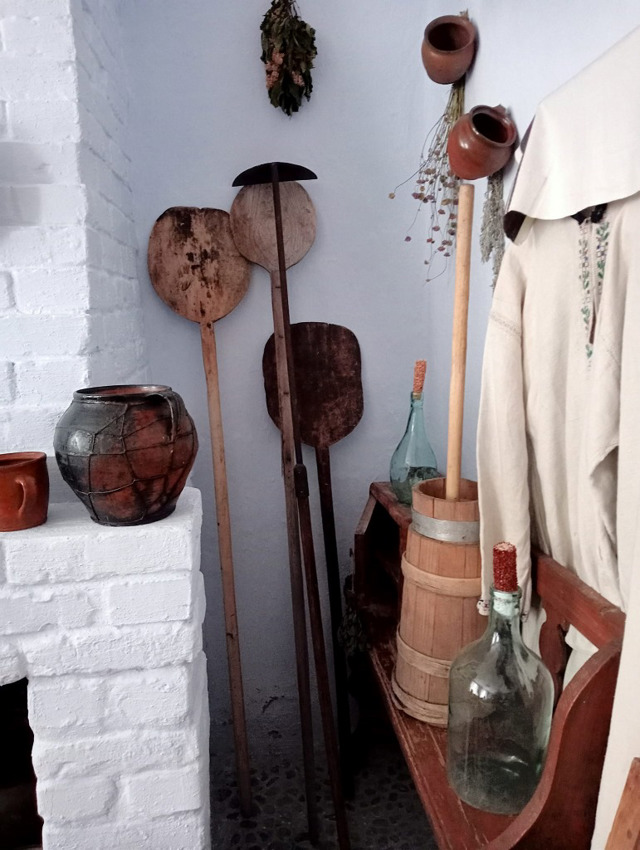 The exhibition presents ancient household items of the villagers, tools, icons, pedestals, old working women's and men's clothing, furniture (bed, bambetel, sideboard (credenza), chest).