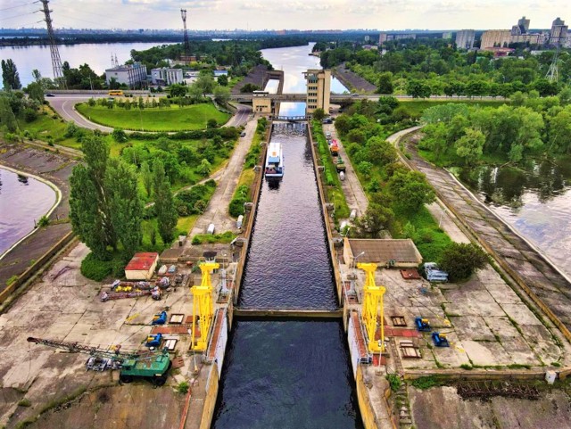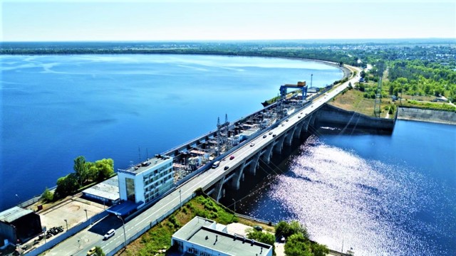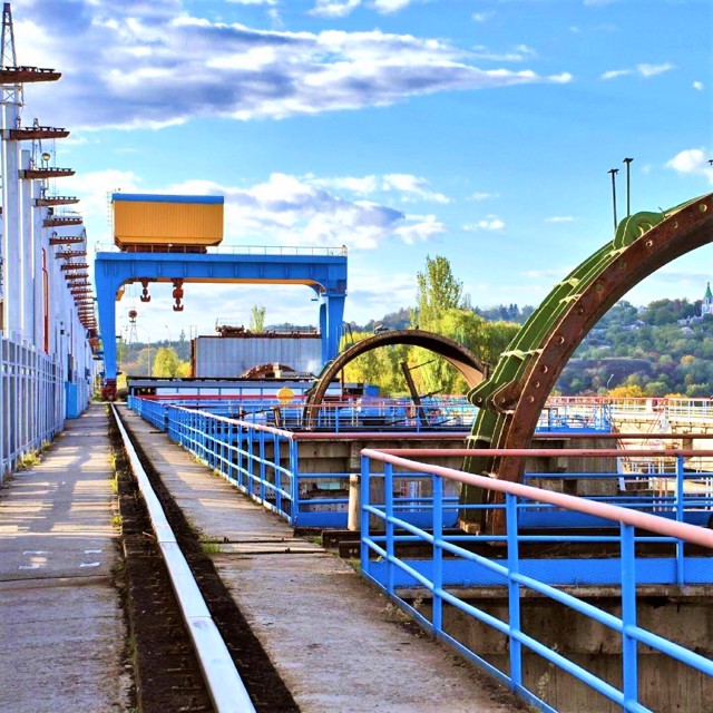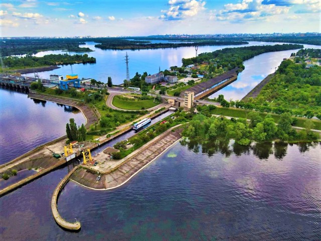 Kyiv HPP - the upper stage of the cascade of hydroelectric power stations on the Dnipro, the first HPP in the USSR, built from prefabricated reinforced concrete structures with the use of horizontal capsule hydro units, which allowed to design the HPP building combined with the spillway part