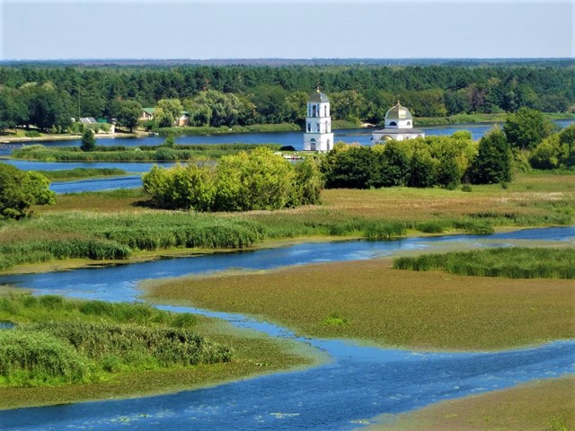 During the creation of the Kaniv Reservoir in 1972, several villages on the outskirts of Rzhyshchiv were flooded. On the site of the former village of Husyntsi, the half-flooded Transfiguration Church with a bell tower has been preserved.